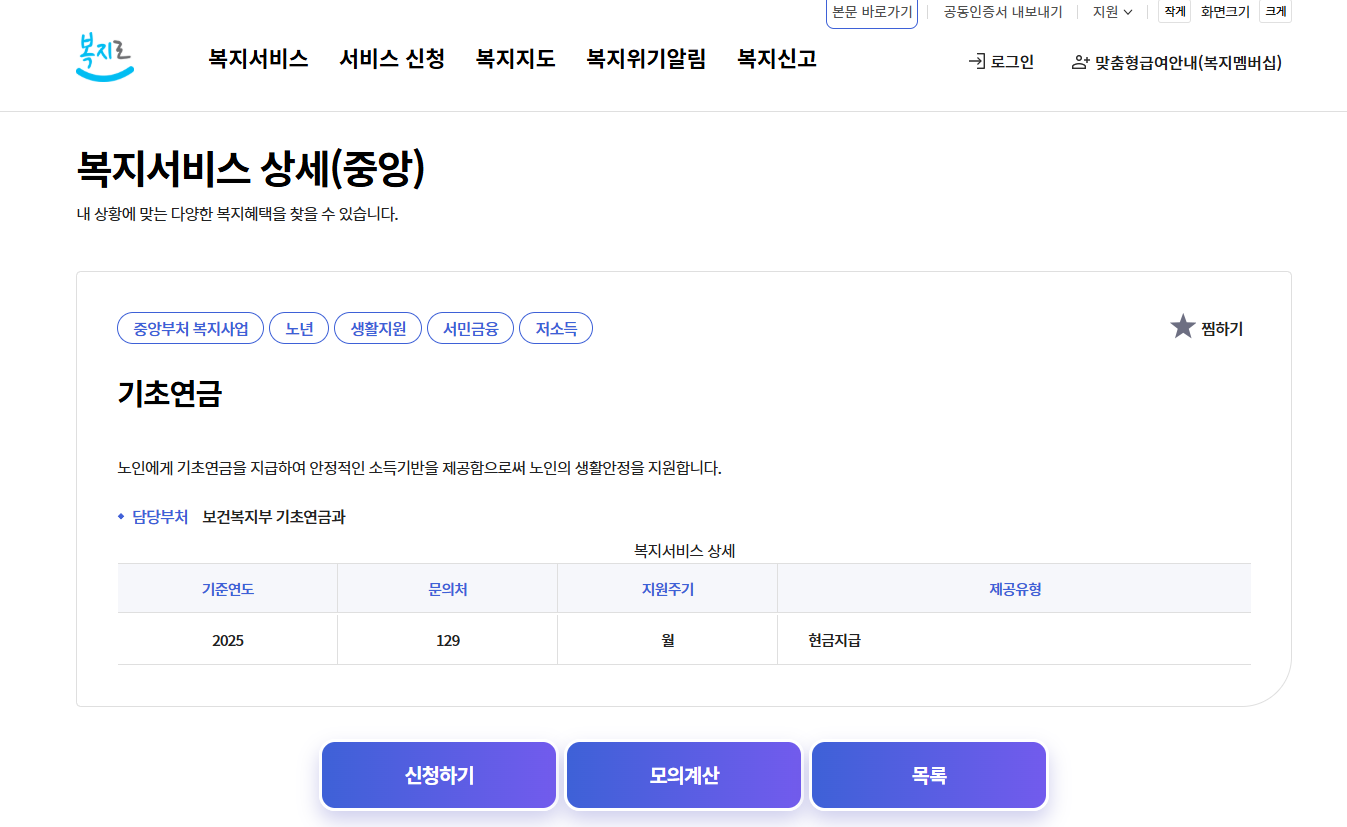 메인 메뉴에서 서비스 신청→복지서비스 신청→복지급여 신청→노년 카테고리에서 기초연금을 선택합니다.